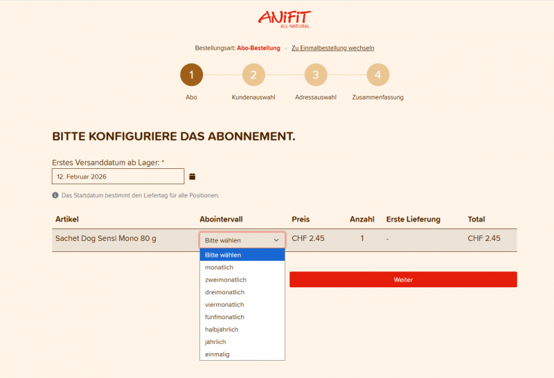 Bestimme anschliessend das erste Versanddatum und wie oft du das Produkt geliefert haben möchtest (Lieferzyklus: monatlich, zweimonatlich usw.).